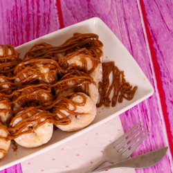 • Served with fudge pieces & caramel sauce & vanilla ice cream